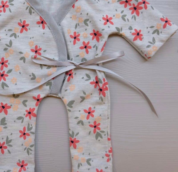 Gemaakt van zachte, rekbare stoffen die perfect aansluiten bij het tere lichaampje van jouw kindje. De delicate bloemetjes geven het pakje een serene en liefdevolle uitstraling, geschikt voor zowel jongens als meisjes. Elk pakje wordt met de hand vervaardigd, met zorg en aandacht voor elk detail.