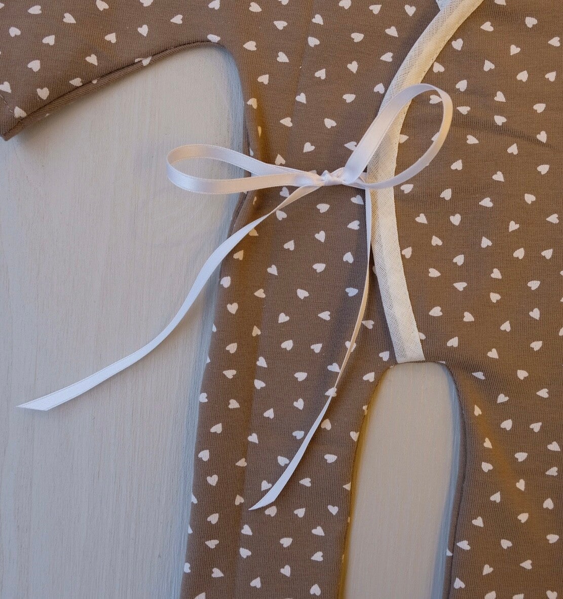 Het sterrenpakje “Liefdevolle Hartjes” is speciaal ontworpen voor sterrekindjes. Dit handgemaakte pakje in warm bruin met witte hartjes symboliseert liefde, verbondenheid en het bijzondere plekje dat jouw kindje altijd in je hart zal hebben.