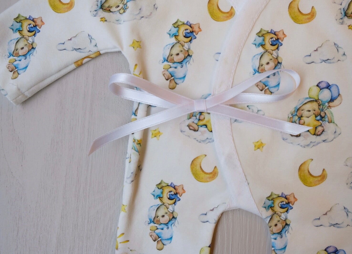 Het zachte witte pakje is versierd met lieve kleine beertjes en een maantje, die een gevoel van geborgenheid en tederheid geven.