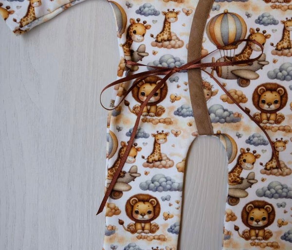 Het zachte witte pakje is versierd met lieve giraffe- en leeuwprintjes, een luchtballon en een vliegtuigje, die samen een gevoel van geborgenheid, tederheid en avontuur oproepen.